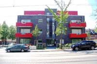 Vom Erdgeschoss des hinteren Gebäudes kann man trockenen Fußes über einen überdachten Weg in das vordere Gebäude gehen und hier ebenfalls alle Geschosse des Gebäudes mit einem Aufzug erreichen. Dieses Gebäude hat ein Kellergeschoss in dem sich ein Fitnessraum befindet, drei Geschosse mit je vier Wohnungen und Balkonen sowie ein Staffelgeschoss mit zwei Wohnungen und Dachterrassen.